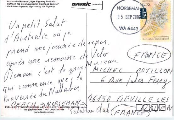 Quelques nouvelles de notre collègue Philippe ROZMUS parti traverser l'Australie à vélo en solitaire.Les couleurs du VCD sont ainsi à l'autre bout du monde. Bon courage à lui pour la suite...